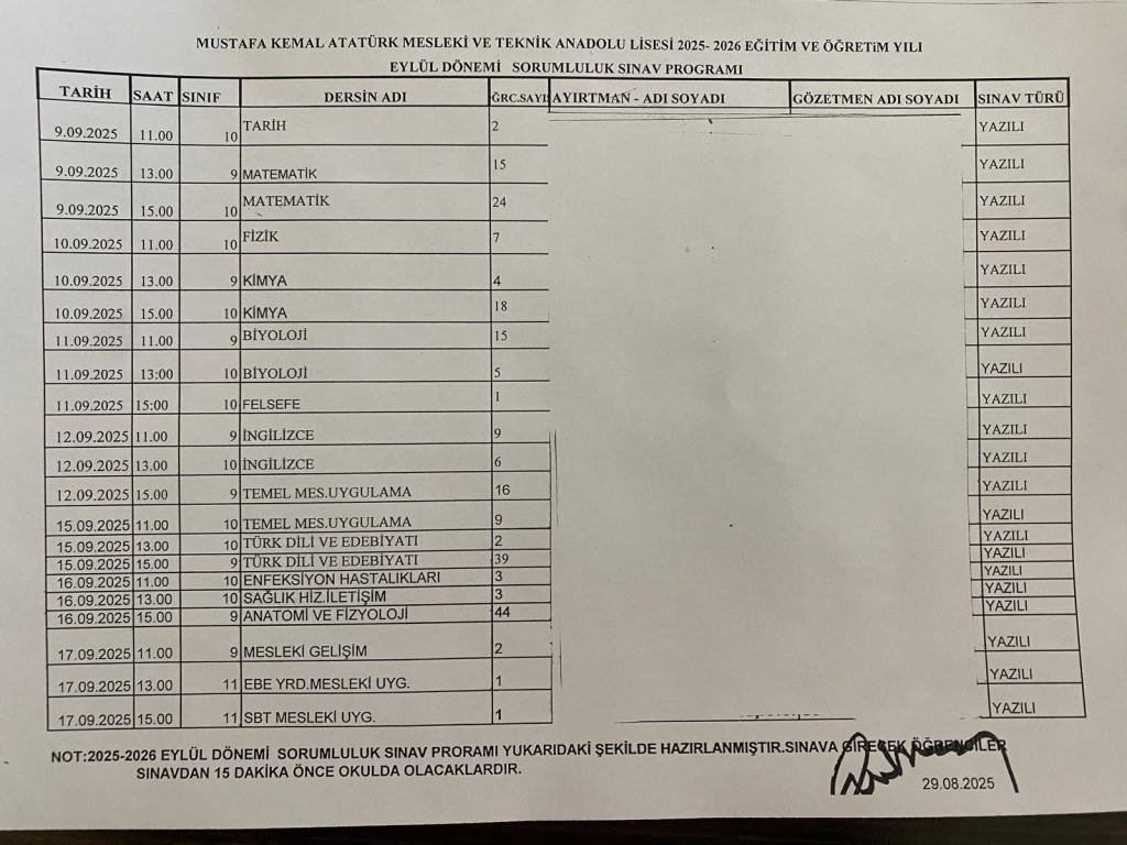 2025-2026 Eğitim Öğretim Yılı Eylül Dönemi Sorumluluk Sınavı Programı